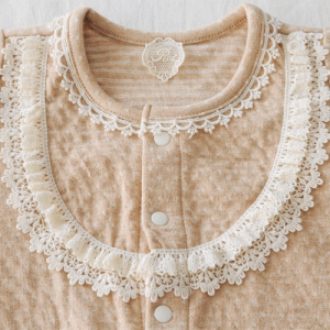 表地がドット柄、裏がボーダーになっているフライス素材にラブリーなオーガニックレース3種類が添えられています。